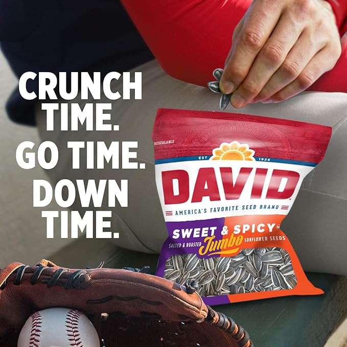 - Contains one 5.25 oz bag of DAVID Sweet and Spicy Jumbo Sunflower Seeds, great for snacking