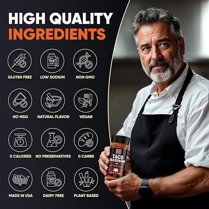 - ✅ GLUTEN FREE, LOW SODIUM & DIET-FRIENDLY: Made with no MSG, no preservatives, and no artificial additives, this gluten free taco seasoning mix is ideal for keto, paleo, vegan, and low-carb diets. With zero calories, no sugar added, and low sodium, it’s the perfect choice for a healthy seasoning mix that doesn’t sacrifice flavor.
