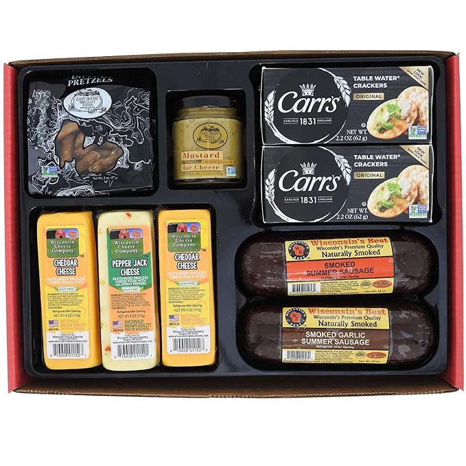 - This gift box isn’t just for special occasions! Keep it on hand for family gatherings, weekend snacks, or as an easy entertaining solution. Pair the cheeses and sausages with crackers, pretzels, mustards, or fruits for an elevated charcuterie experience.