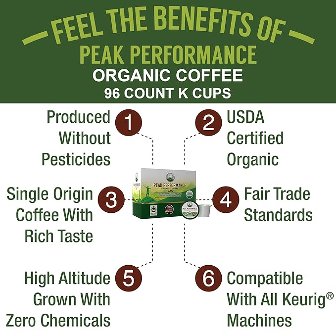 USDA Organic Coffee Pods. Compatible With K-CUP And Keurig Machines. High Altitude USDA Organic Coffee. Fair Trade Low Acid Beans Medium Roast Single Serve 96 Count Recyclable Cups For High Performers