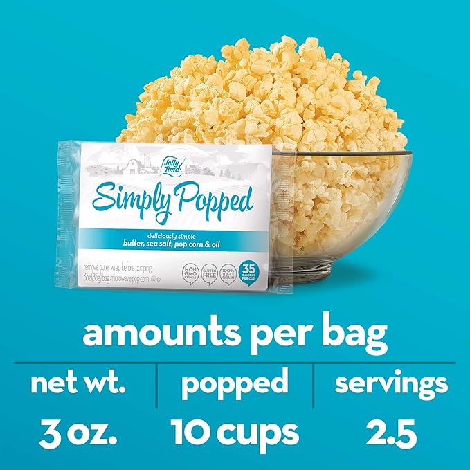 Jolly Time Simply Popped - Lightly Salted Microwave Popcorn, 3oz Sharing Bag, 3 Bags Per Carton (Simply Popped Butter, 3 Ounce (Pack of 12))