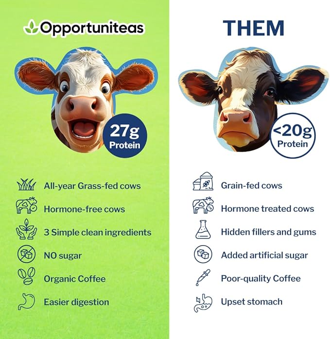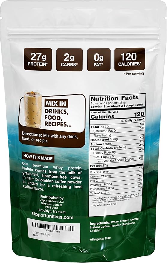 - 27G PROTEIN + 60mg CAFFEINE - Save time during busy mornings before or after workouts. One serving contains the same amount of caffeine as a cup of coffee and plenty of protein to help you recover quickly from a challenging workout or exercise. Opportuniteas offers one of the highest protein concentrations ensuring you get the protein your muscles need.