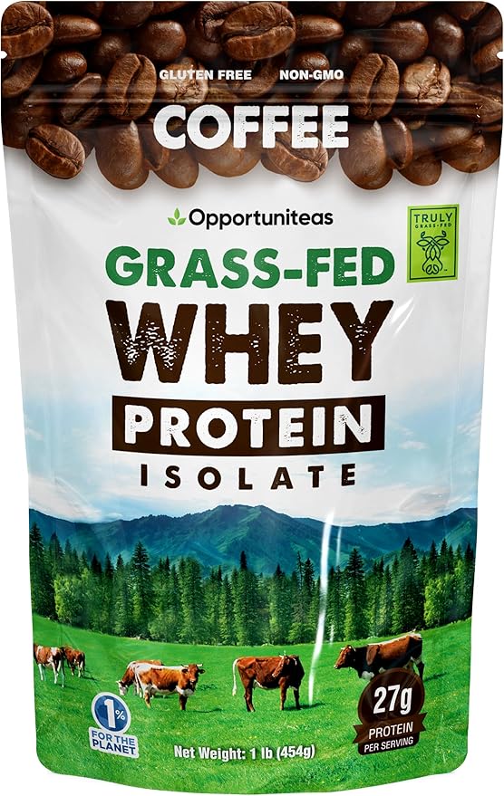 Opportuniteas Coffee Whey Protein Powder - Low Carb & Keto Friendly - Grass Fed Whey Isolate + Colombian Coffee - 60 mg Caffeine for Energy - Pre or Post Workout Drink Mix, Latte, Shake & Smoothie 1lb