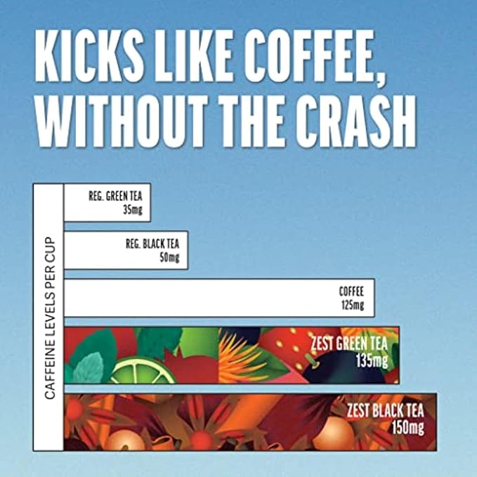 - 135-150mg Caffeine Per Cup: Our strong black and green hot teas have more caffeine than coffee; 3x the energy levels of traditional caffeinated teas. This makes Zest the strongest tea on the market, and is the perfect high energy pick me up for your morning or mid-day slump.