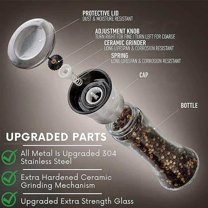 - High Quality Glass - Brushed Stainless Steel Salt and Pepper Mill Set : Home EC Salt and Pepper Mills are easy to grip and made of the highest grade non-corrosive, brushed Stainless Steel, and BPA Free glass bottle. This salt grinder and pepper grinder set is a modern, classy and user friendly addition to your kitchen accessories. Perfect for a gourmet meal or dinner party. Great gift or party favor! *Salt and Pepper Not Included.