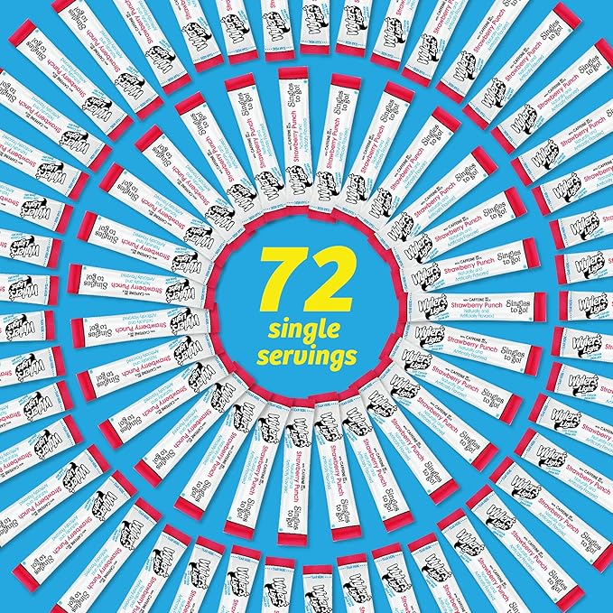 - 72 TOTAL SERVINGS: Each case contains 12 boxes of Wyler’s Light, each box has 6 tasty packets of Wyler’s Light Caffeinated Strawberry Punch water enhancer giving you a total of 72 refreshing single servings.