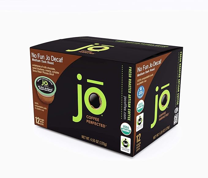 No Fun Jo Decaf: 12 Organic Compostable Pods for Keurig K-Cup Compatible Brewers, Swiss Water Process Single Serve Coffee Medium/Dark Roast Fair Trade