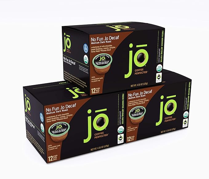 No Fun Jo Decaf: 36 Organic Compostable Pods for Keurig K-Cup Compatible Brewers, Swiss Water Process Single Serve Coffee Medium/Dark Roast Fair Trade
