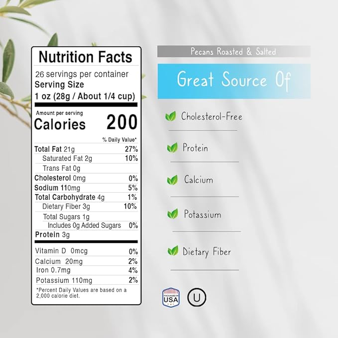 Pecans Whole Roasted Salted - 26 oz Reusable Container | Rich in Antioxidants | Low Carbs | Everyday Healthy Snack | Vegan | Keto Friendly | Certified Kosher | Great for Gift Giving, Baking, Cooking