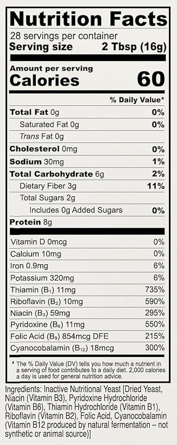 - Fortified with B Vitamins, including Folic Acid and B12 (produced by natural fermentation - not synthetic or animal source)