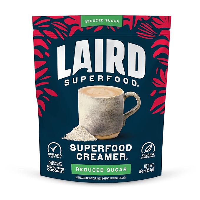 - Laird Superfood Non-Dairy Reduced Sugar Powder Coffee Creamer: Contains one 16 oz. bag of plant-based coffee creamer, unsweetened, non-dairy, and shelf-stable.