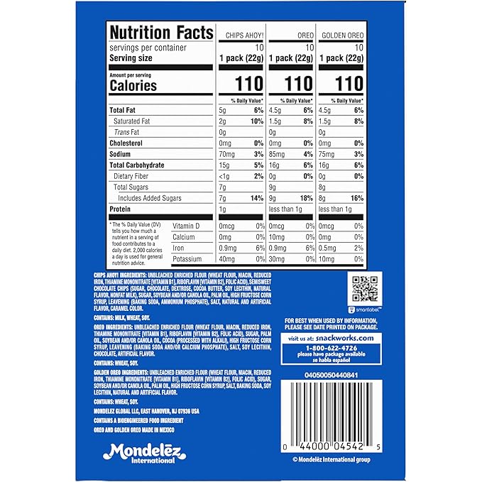 - Full-size OREO cookies and CHIPS AHOY! cookies in convenient snack packs