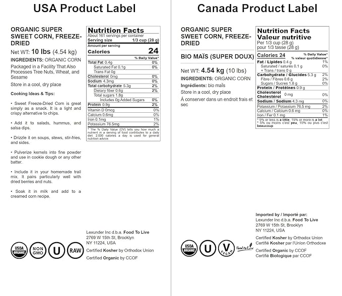 Food to Live Organic Super Sweet Corn, 10 Pounds - Freeze-Dried Kernels, Non-GMO, Kosher, Healthy Snack, Bulk, Grown in the USA