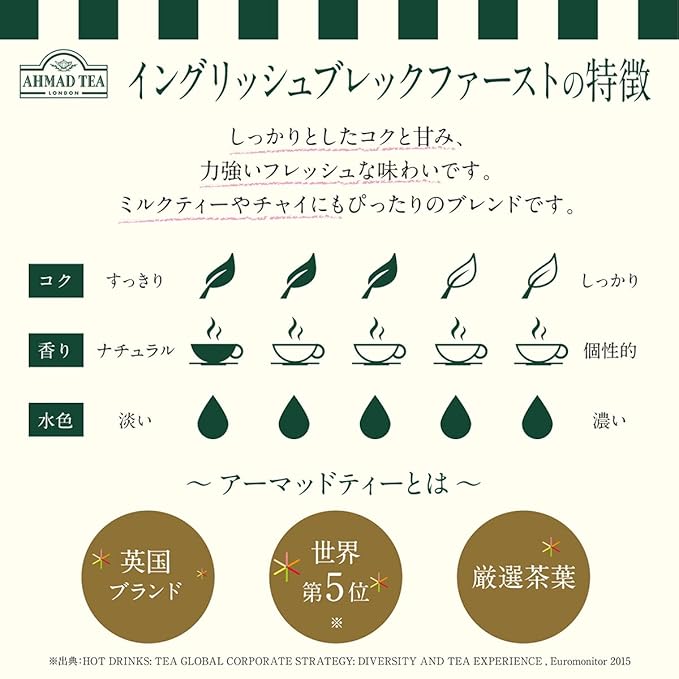 - DELICIOUS & SATISFYING FLAVOR – Ahmad Tea earned 22 Great Taste Awards, English Breakfast being a fan favorite. Complex flavors that are bold and smooth.