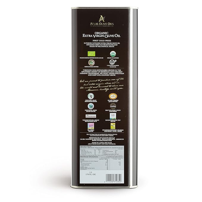 A ATLAS OLIVE OILS Bulk Organic Cold Pressed Moroccan Extra Virgin Olive Oil, Polyphenol Rich, Newly Harvested Unprocessed from One Single Family Farm Cold Press Ext. Virgin 170 Fl Oz (Pack of 1)
