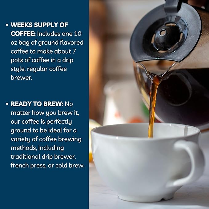 - WEEKS SUPPLY OF COFFEE: Includes one 10 oz bag of flavored wholebean coffee to make about 7 pots of gourmet coffee in a drip style, regular coffee brewer.
