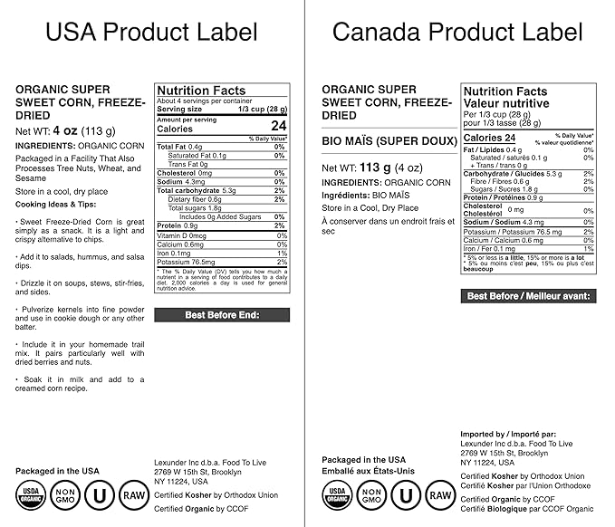 Food to Live Organic Super Sweet Corn, 4 Ounces - Freeze-Dried Kernels, Non-GMO, Kosher, Healthy Snack, Bulk, Grown in the USA