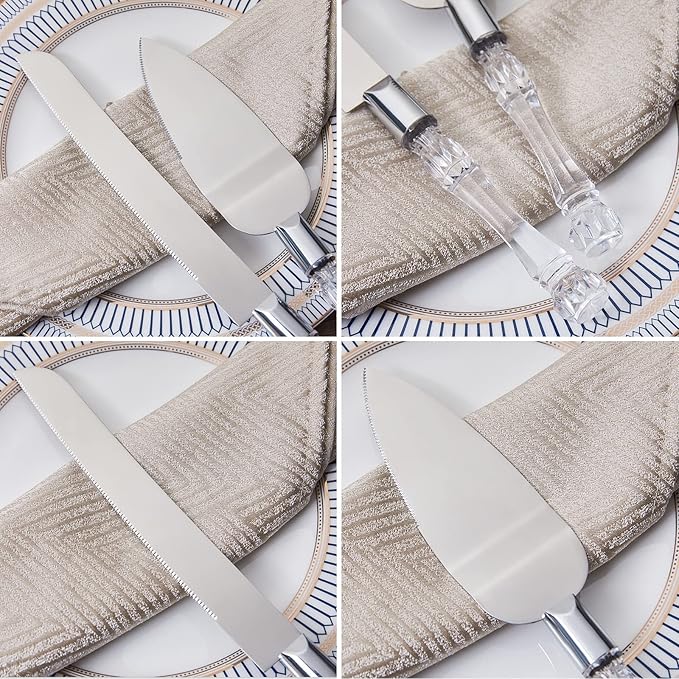 - 🍰Premium Material- Imitated crystal handles with stainless steel blades, mirror polished, rust-proof, high-temperature and corrosion-resistant. Cake server is 10.8 inch/27.5cm long, cake knife is 13.2 inch/33.5cm long, the perfect size for cake cutting and serving.
