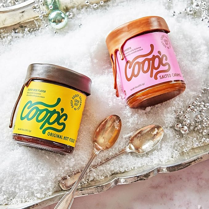 Coop's Original Hot Fudge & Salted Caramel Sauce (2- Pack): Gourmet, All Natural, Handcrafted, Gluten Free, Non-GMO, Chocolate Ice Cream Toppings, Sundae, Desserts, 10 Ounce each