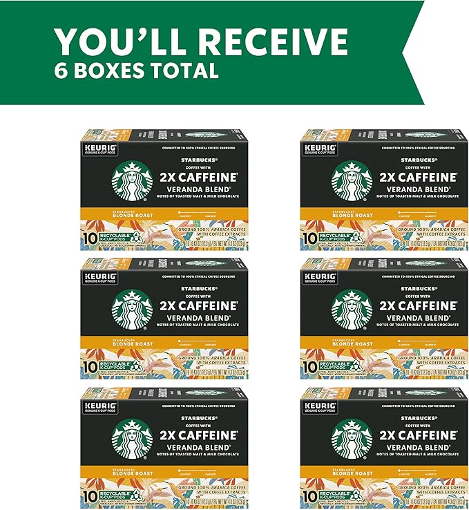 - 2X THE CAFFEINE: Starbucks Coffee With 2X Caffeine Veranda Blend K-Cup Pods deliver 2X the caffeine compared to one pod of Starbucks K-Cup black coffee when brewed as directed. Includes 60 total coffee pods for Keurig coffee makers.