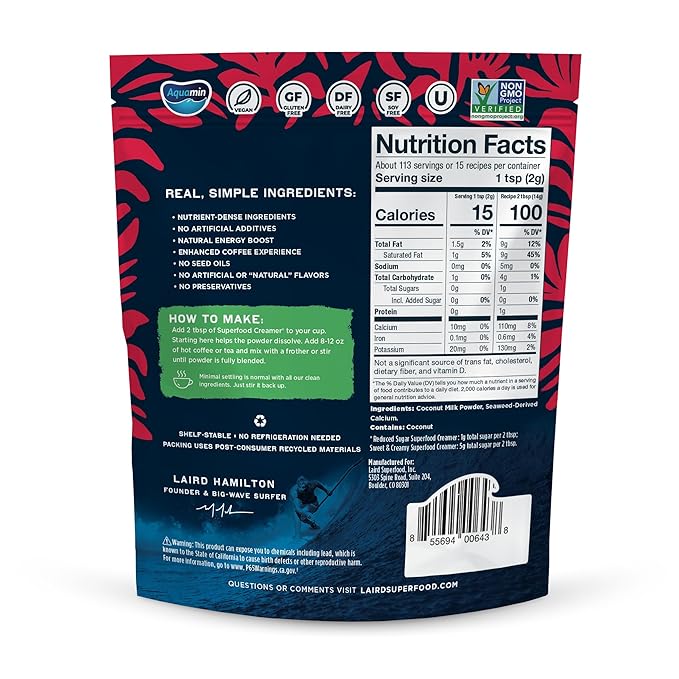 - Laird Superfood Non-Dairy Reduced Sugar Powder Coffee Creamer: Contains one 8 oz. bag of plant-based coffee creamer, unsweetened, non-dairy, and shelf-stable.