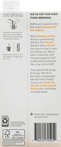 TAZO Decaf Chai Latte, Black Tea Concentrate, Easy-to-Serve Chai Tea for Everyday Lattes, Hot or Iced Tea and Mocktails, 32 oz Tea Mix Carton