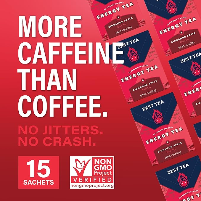 Zest Tea Premium Energy Hot Tea, High Caffeine Blend Natural & Healthy Traditional Coffee Substitute, Perfect for Keto, 150 mg Caffeine per Serving, Apple Cinnamon Black Tea, Box of 15 Sachet Bags