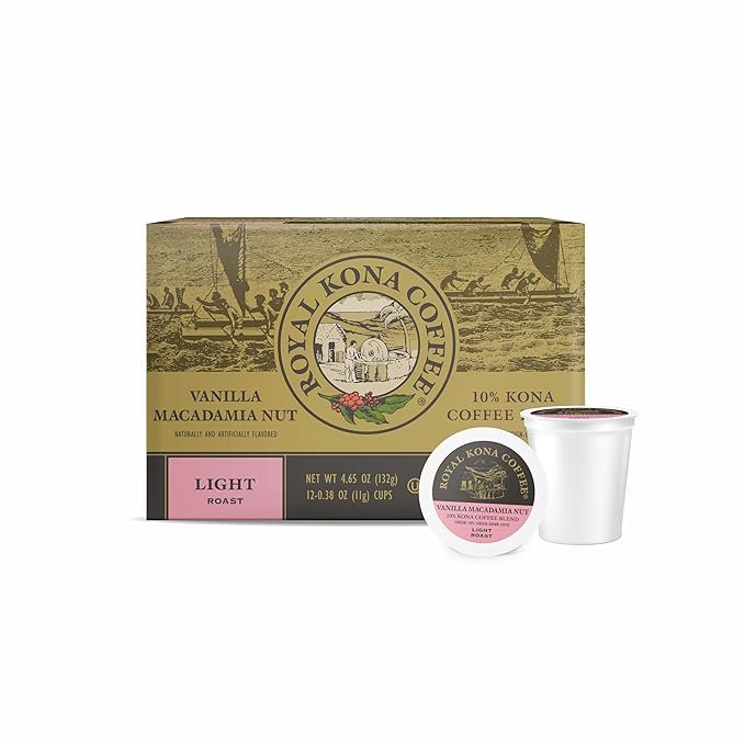 Royal Kona Vanilla Macadamia Flavored, 10% Kona Coffee Blend, Light-Roast Single-Serve Coffee Pods, Compatible with Keurig® Brewers, A Taste of Aloha - (12 Count Box)