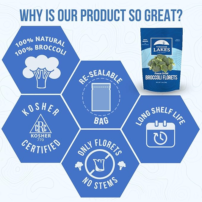 Thousand Lakes Freeze Dried Vegetables - Broccoli Florets 4-pack 1.2 ounces (4.8 ounces total) | 100% Florets - No Stems | No Salt Added