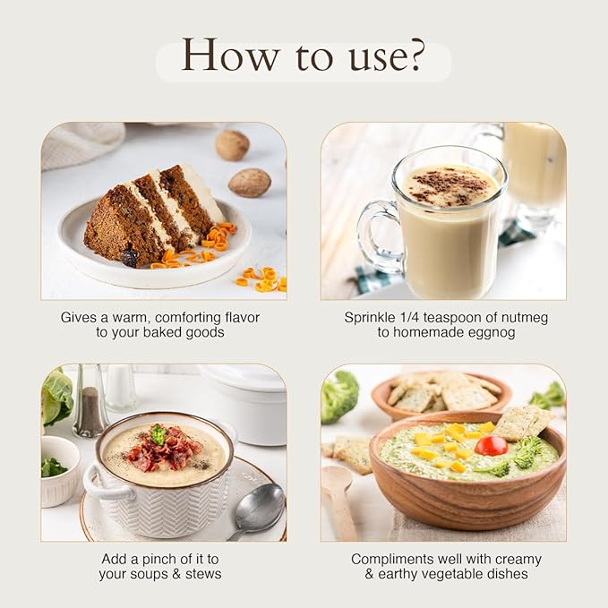- VERSATILE CULINARY INGREDIENT – Use our organic nutmeg powder in pumpkin spice lattes, desserts, curries, soups, and holiday recipes. It’s a pantry essential for every kitchen.