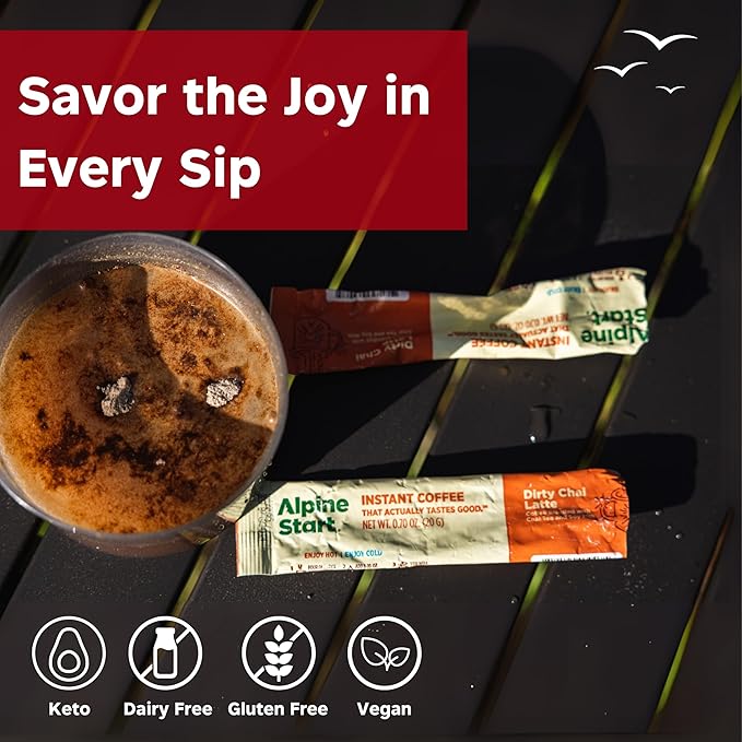 - Premium instant coffee for any adventure - Our dirty chai latte comes in individual instant coffee packets that are lightweight, portable, and convenient for backpacking meals or any adventure.