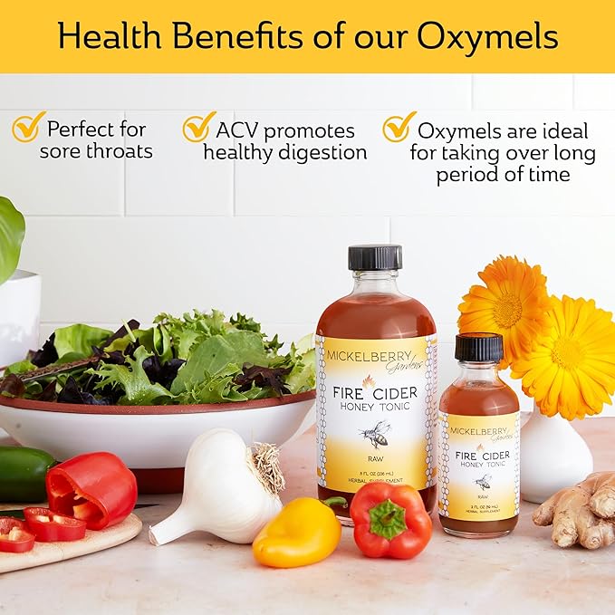 - Take your taste buds for a delicious walk on the wild side with Mickelberry Gardens’ Fire Cider Honey Tonic. Invigorate your senses and digestive enzymes with this raw oxymel probiotic, formulated to restore gut health and aid digestion. Our traditional oxymel formula is made with a delicious blend of raw Pacific Northwest honey, certified organic raw apple cider vinegar, and certified-organic herbs.