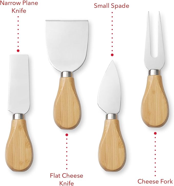 - Cheese board & cutlery gift set: This charcuterie gift set includes bamboo cheese board and four stainless steel serving utensils. Our cheese board is the ideal gift for any occasion, including a bridal shower, wedding, holiday, birthday, housewarming, and more.