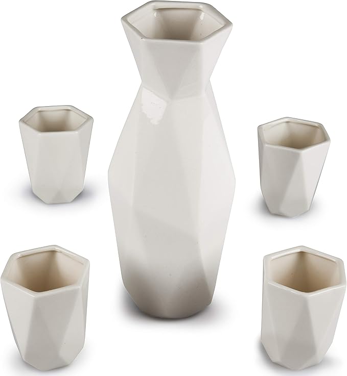 D'Eco 5 Piece Traditional Porcelain Japanese Sake Set, White - 1 Tokkuri Bottle (18 oz) and 4 Ochko Cups - Unique Modern Design - Great Gift Set for Weddings or Housewarmings