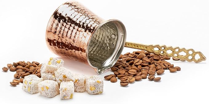 - TURKISH COFFE POT, It's All Made of Thick Copper; Outside is Hammered, Completely Handmade;Perfect for Turkish Coffee Pot, Greek Coffee Pot, Arabic Coffee Pot, Briki, Milk Pot, Small Sauce Pan or Butter Melter; SPECIAL DESIGN, Strong and Ergonomic Handle, Food Safe Tin Lining Inside;Handle can get hot, please use oven mitts