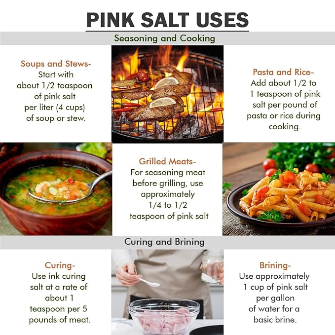 - PINK SALT JAR FOR COOKING: Use our pink salt jar in everyday cooking for a gourmet touch. Add a pinch (about a quarter teaspoon) per serving size portion to enhance flavor while balancing electrolytes, pH levels, and hydration. Ideal for seasoning and brining, or use in a dual sifter pink salt shaker or grinder for convenience