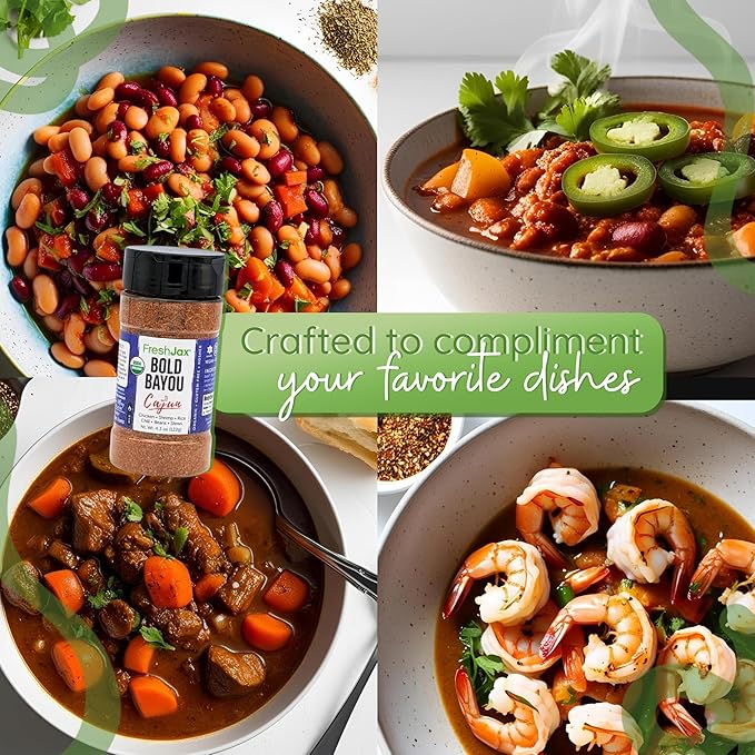 - BOLD BAYOU CAJUN SEASONING : Transport the flavors of New Orleans to your kitchen with Bold Bayou, a smoky and powerful blend of paprika, cayenne, red pepper, and nutmeg, perfect for Cajun-inspired dishes.