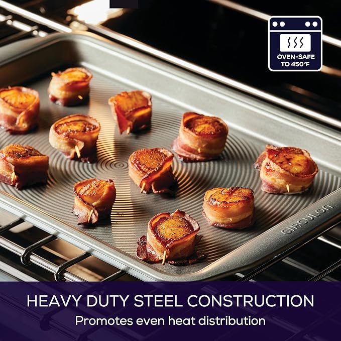 - COOKIE SHEETS STAND UP TO TIME: Heavy-duty steel construction offers uniform heat distribution, and the cookie sheets’ warp-resistant rolled edges provide extra strength