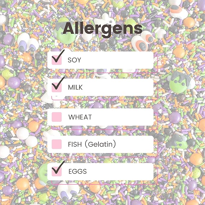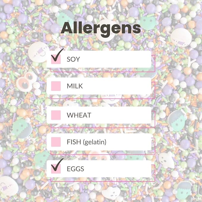 - Allergen & Safety Notice: Made in a facility that processes wheat, eggs, milk, soy, and tree nuts. Some blends contain hard sugar pearls and dragee rods, which may pose a choking hazard for children under 1