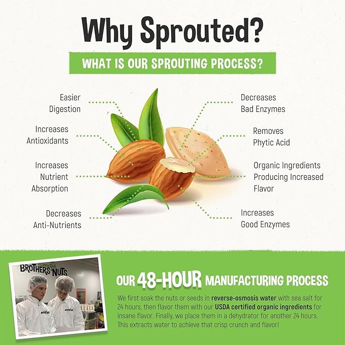 - SPROUTED ALMOND NUTS: Better than raw almonds, the sprouted almonds we use are carefully picked. For you, this means snacking on mouth watering treats with nutrients that are quickly absorbed by your body.