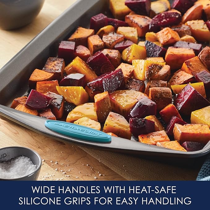Rachael Ray Bakeware Nonstick Cookie Pan Set, 3-Piece, Gray with Agave Blue Grips