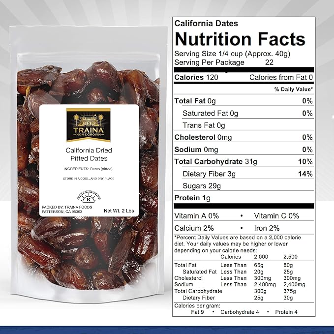 Traina Home Grown California Dried Pitted Dates - Healthy, No Added Sugar, Non GMO, Kosher Certified, Vegan, Packed in Resealable Pouch (2 lbs)