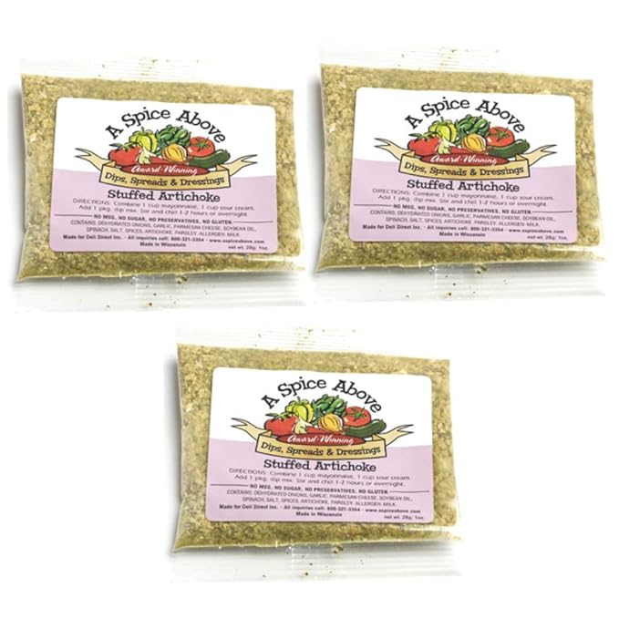 A Spice Above Dips, Spreads, and Dressing Mixed Seasonings Party Packets, 3 Pack (Stuffed Artichoke)