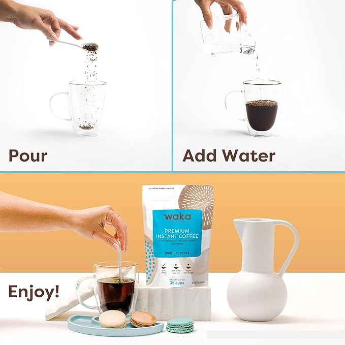 - Premium Instant Coffee: Made from 100% Arabica Colombian coffee beans, Waka Instant Coffee is freeze-dried to preserve the rich aroma and flavor of each roast. Enjoy pure, unsweetened vegan-friendly coffee without any sugar, additives, or artificial ingredients.