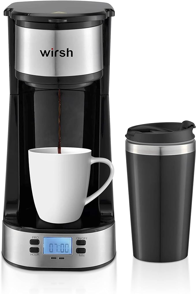 - PROGRAMMABLE SINGLE SERVE COFFEE MAKER - The wirsh single cup coffee maker comes with Illuminated LCD display with programmable 24-hour time, you can make a preset for brewing coffee in anytime. Simply fill the 14oz water tank, pop your favourite ground coffee into the washable permanent filter and press the power on switch. After few minutes the single brewer will dispense your delicious hot coffee into the mug, ready for you to simply grab and go.