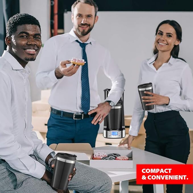 - COMPACT DESIGN - The coffee machine has a sleek and stylish design, it is the perfect size for tight counter spaces or tiny cubicles in the workplace and can be easily transported from one location to the next. The travel mug will fit most car cup holders and will soon be your best friend on morning commutes.