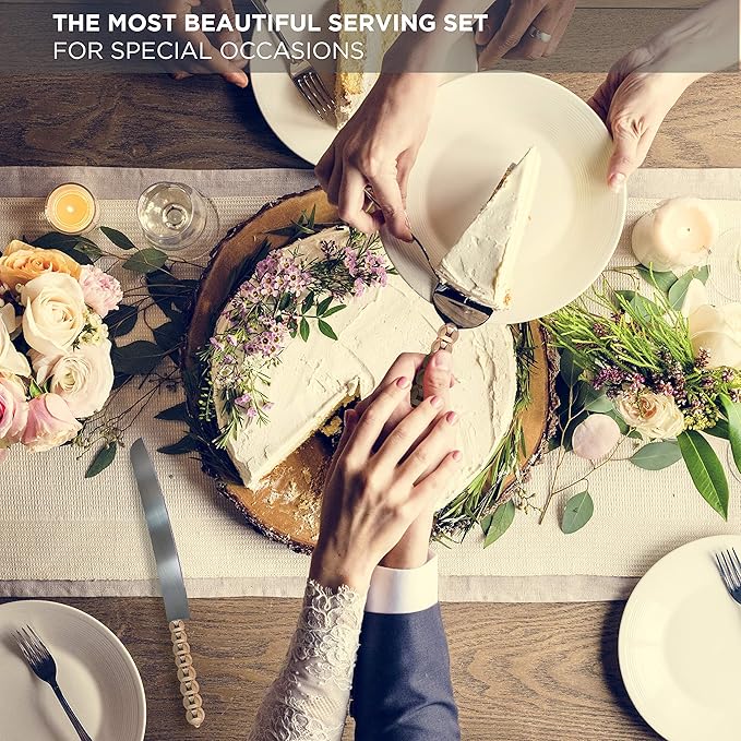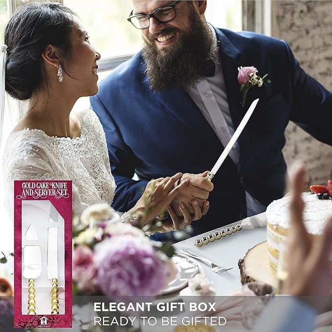 - 🍴 THE MOST BEAUTIFUL SERVING SET FOR SPECIAL OCCASIONS - From your Wedding Day to Anniversaries, Birthdays and Shower Parties, this amazing Gold Wedding cake knife and server set with its timeless gold color and unique beaded handles will be by your side to add a touch of elegance to your special moments!