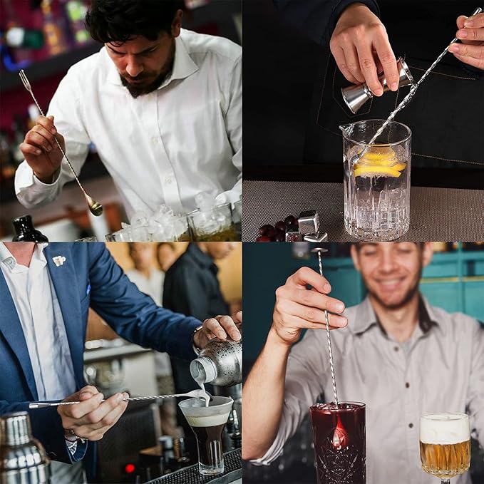 - MULTIPURPOSE BAR SPOONS - You will get 4 Pcs different size bar stirring spoons, these bar stirring spoons can be used in bars, coffee shop, milk tea shop, party, restaurants, office, or even at home, Great for stir and mix up cocktails, rum, whiskey, scotch, brandy, tequila, vodka, gin, sake, drinks, juice, coffee, ice tea, and milkshakes etc.