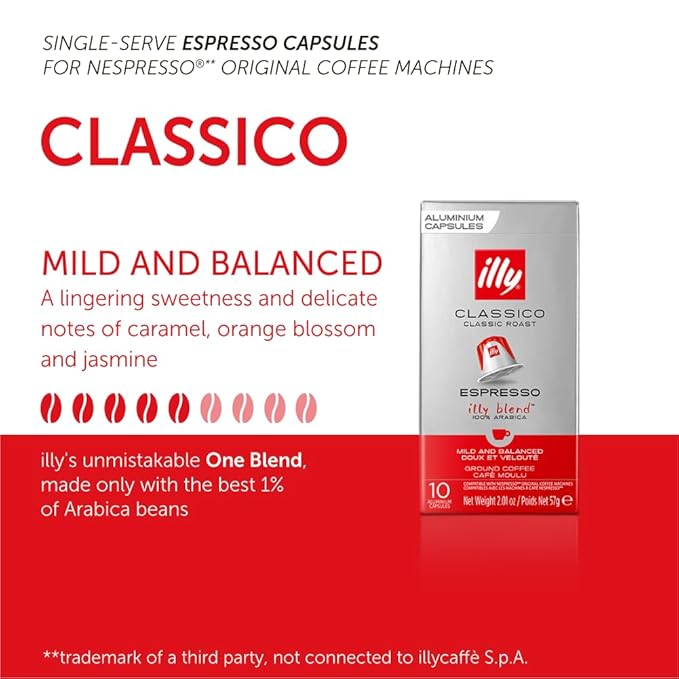 Illy Espresso Compatible Capsules - Single-Serve Coffee Capsules & Pods - Classico Roast - Notes Of Caramel, Orange Blossom & Jasmine Coffee Pods - For Nespresso Coffee Machines – 10 Count