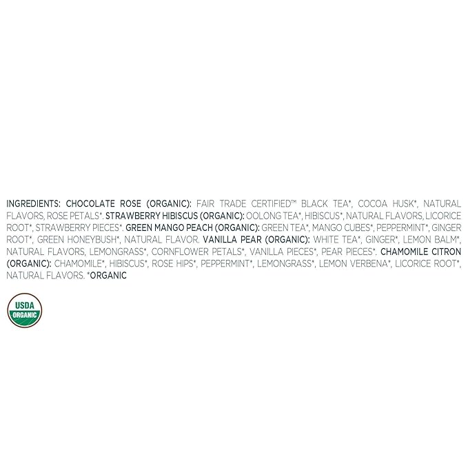 - SOPHISTICATED COLLECTION includes five organic tea blends, 2 infusers of each blend: Chamomile Citron (Herbal), Chocolate Rose (Black), Green Mango Peach (Green), Strawberry Hibiscus (Oolong), and Vanilla Pear (White)